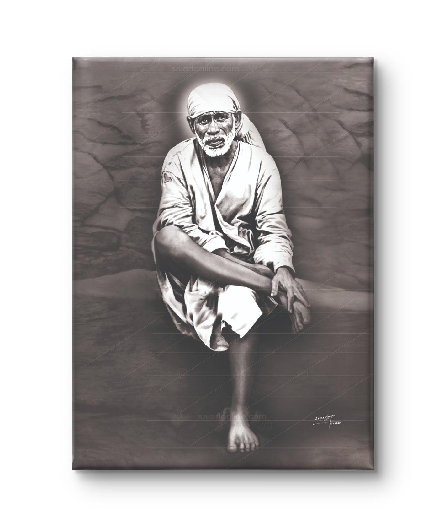 Shirdi Sai Baba Original Photo Sitting on Stone Canvas Painting | UV Coated Waterproof HD Wall Art by Hemant Art